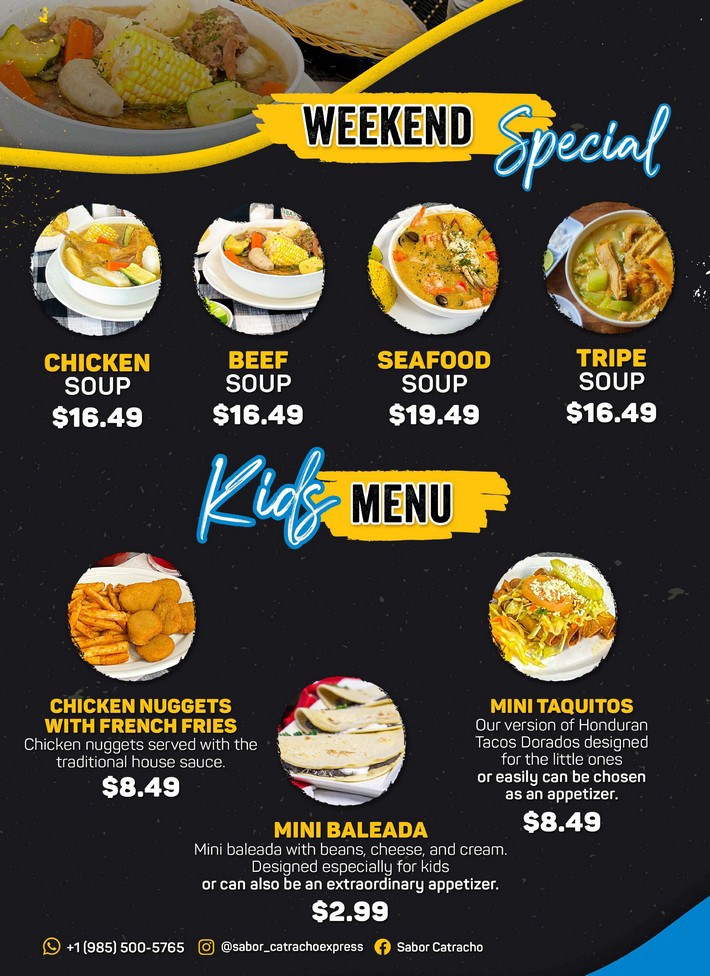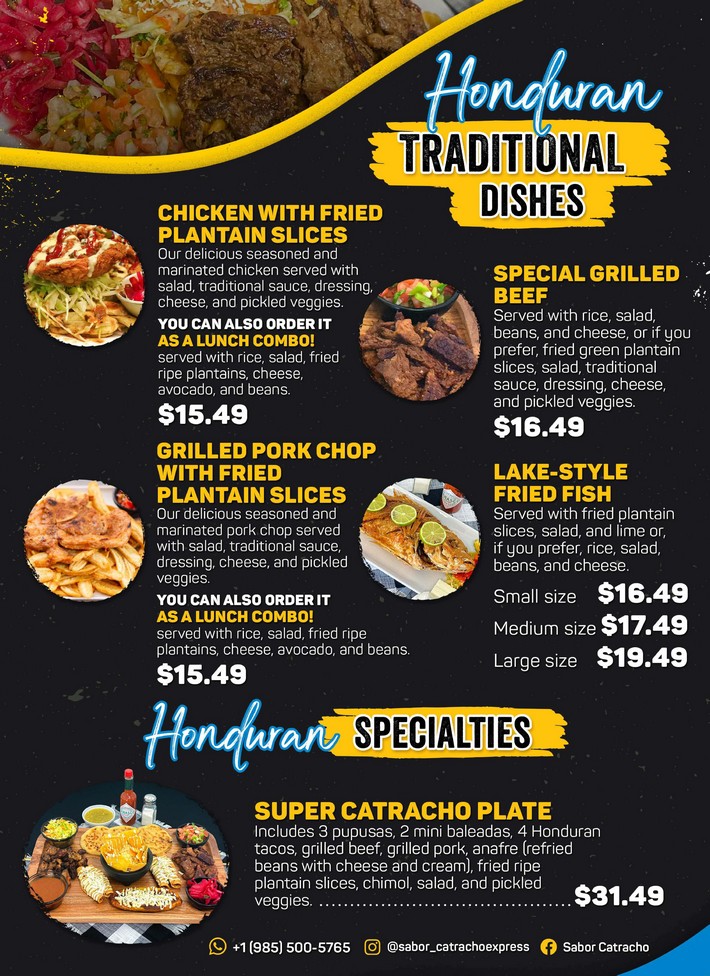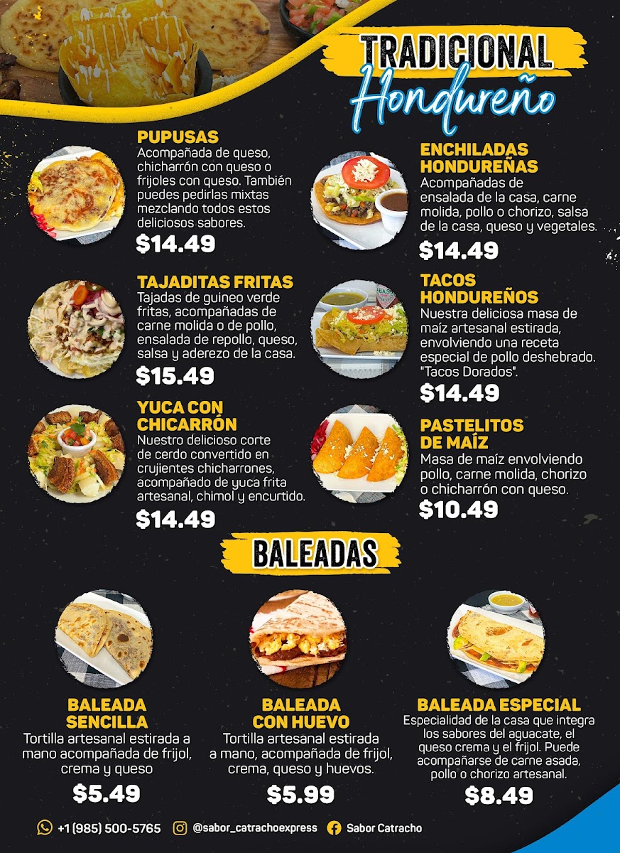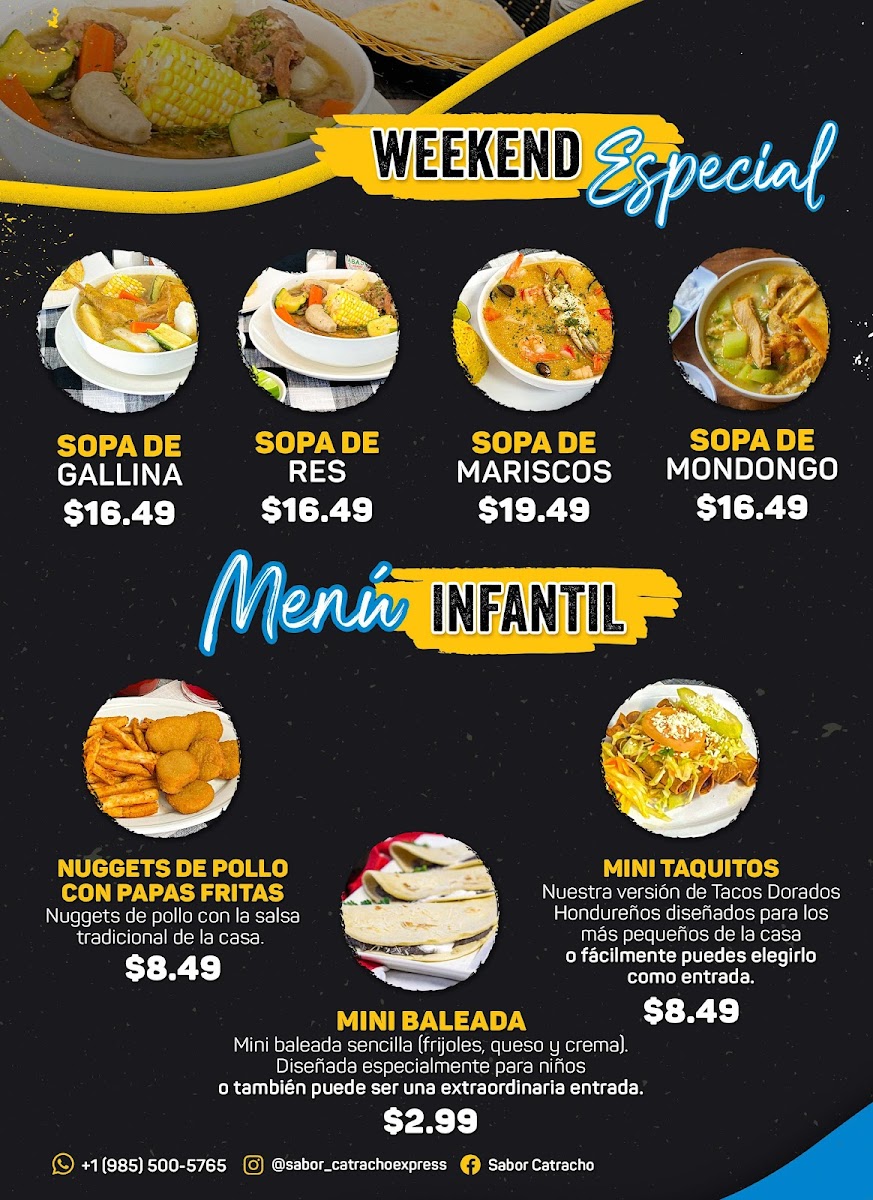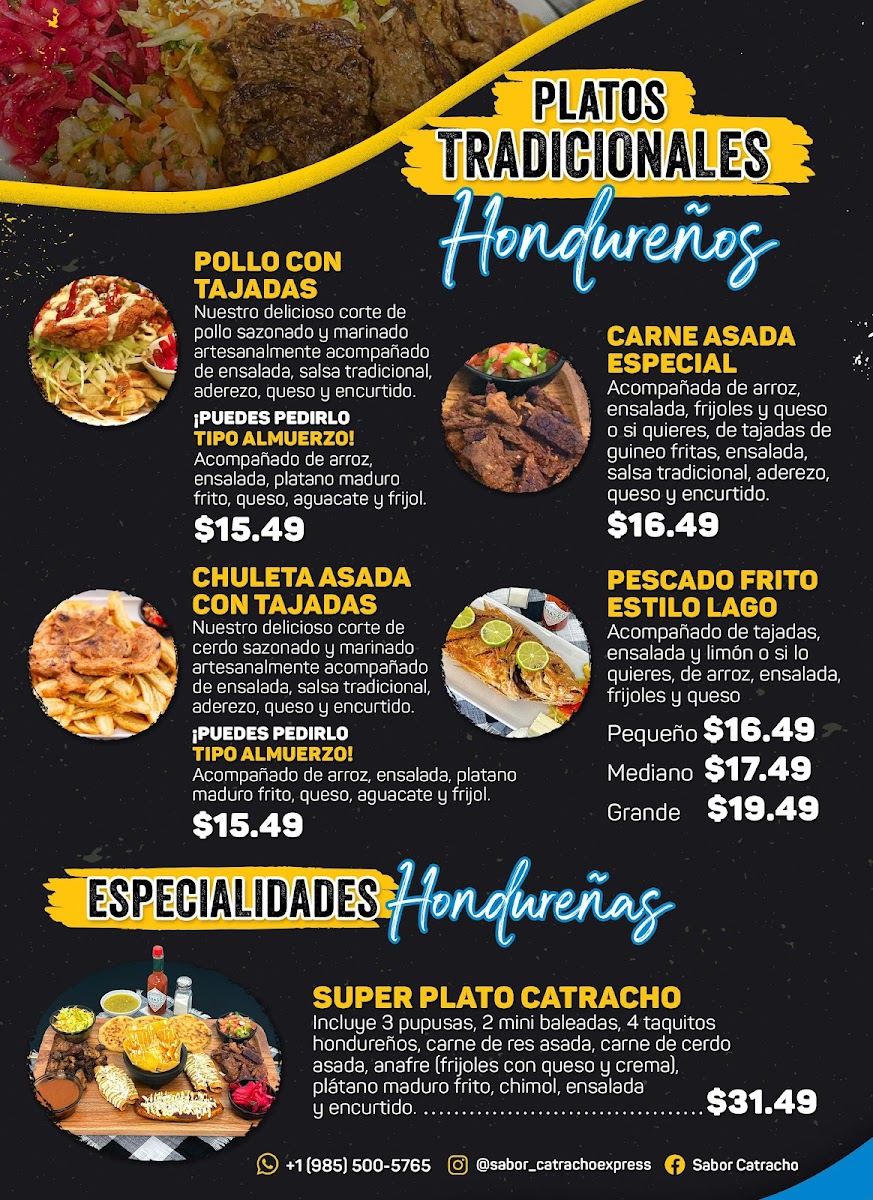 From a reviewer’s perspective, the menu at Sabor Catracho Express Latin Food showcases an inviting variety of Honduran and Latin American comforts that make it easy to explore traditional and hearty dishes without breaking the bank. Standouts include the generous Baleada Especial - $8.49 and the beloved Super Plato Catracho - $36.99, a sharing platter that lets you sample several favorites in one go, both frequently highlighted by regulars. Classic entrees like Pollo con Tajada - $15.49 and Carne Asada - $16.49 bring robust flavors, while the Pupusas - $14.49 offer a satisfying take on a Central American staple. Soups such as the Sopa de Gallina - $16.49 and sides like Pastelitos de Maíz con Pollo - $10.49 extend the menu’s depth, and cooling beverages like Horchata Grande - $6.00 and Jamaica Grande - $5.49 round out the meal with refreshing balance. Overall, the menu blends familiar and authentic options with clear prices that reflect both quality and value.