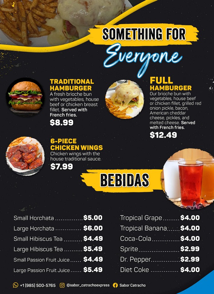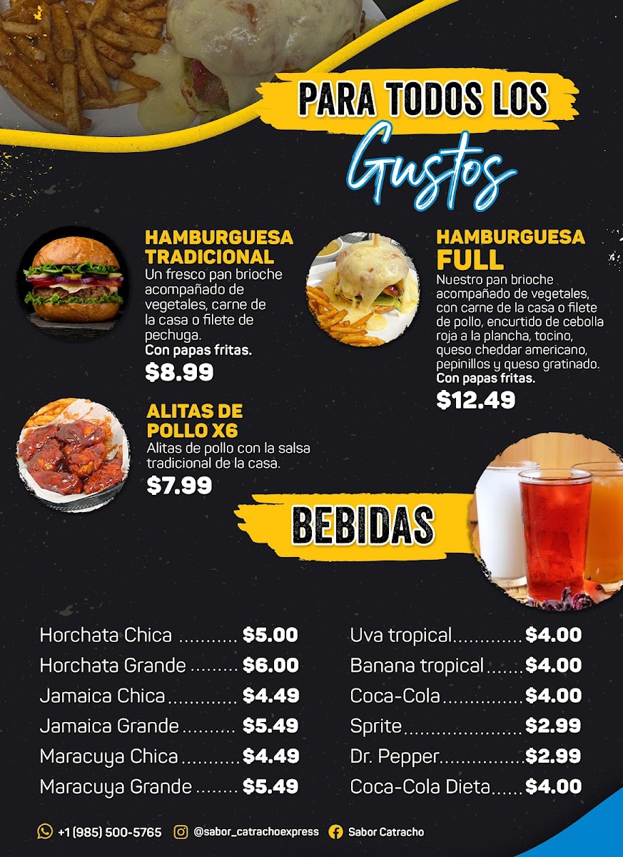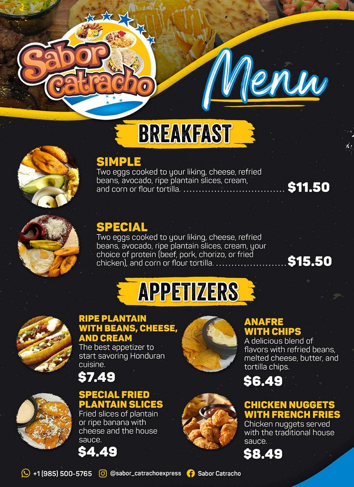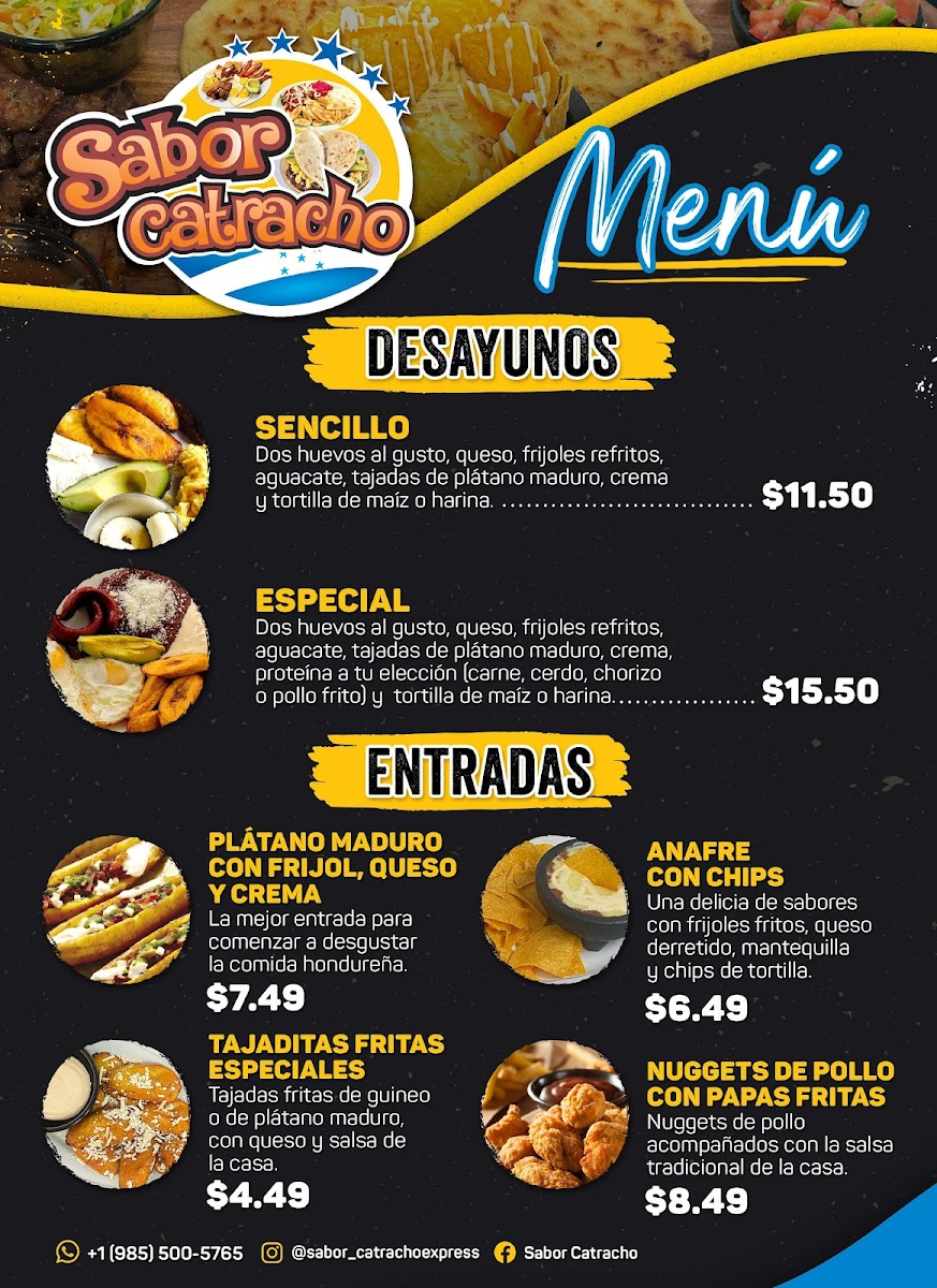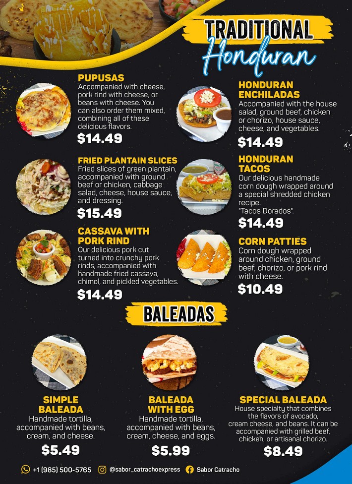 From a reviewer’s perspective, the menu at Sabor Catracho Express Latin Food showcases an inviting variety of Honduran and Latin American comforts that make it easy to explore traditional and hearty dishes without breaking the bank. Standouts include the generous Baleada Especial - $8.49 and the beloved Super Plato Catracho - $36.99, a sharing platter that lets you sample several favorites in one go, both frequently highlighted by regulars. Classic entrees like Pollo con Tajada - $15.49 and Carne Asada - $16.49 bring robust flavors, while the Pupusas - $14.49 offer a satisfying take on a Central American staple. Soups such as the Sopa de Gallina - $16.49 and sides like Pastelitos de Maíz con Pollo - $10.49 extend the menu’s depth, and cooling beverages like Horchata Grande - $6.00 and Jamaica Grande - $5.49 round out the meal with refreshing balance. Overall, the menu blends familiar and authentic options with clear prices that reflect both quality and value.